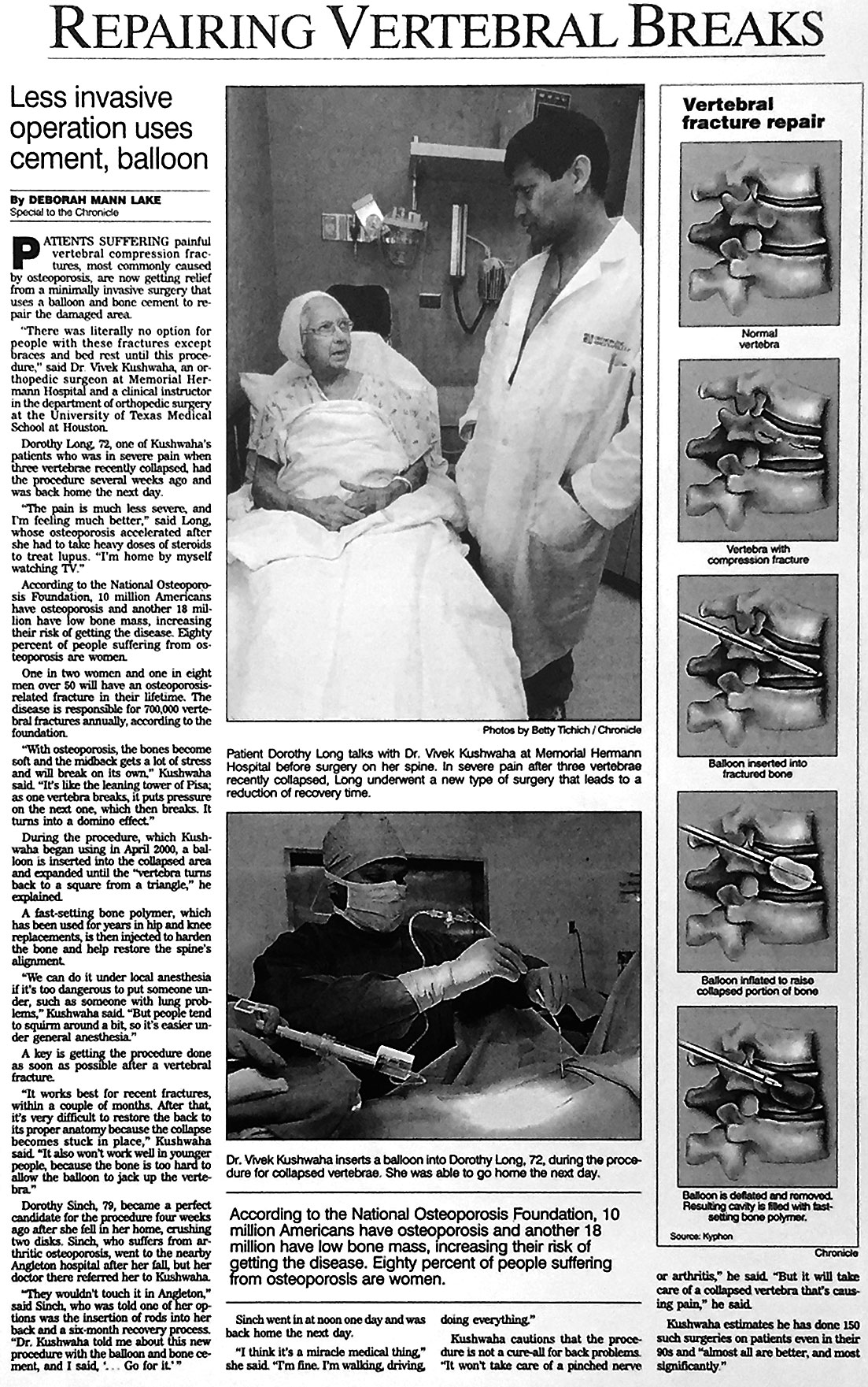 Dr. Vivek P Kushwaha has been honored with the Memorial Hermann Hospital Award for “Most Efficient Surgeon” and was commended as one of “America’s Top Physicians” by The Consumer Research Council of America. He has extensive experience in complicated spine surgery, including revision surgery and the latest techniques in kyphoplasty, disk replacement, and microdiskectomy as well as minimally invasive spinal instrumentation and fusion. Dr. Kushwaha was the first surgeon in Houston to perform the kyphoplasty procedure, as well as the first surgeon to perform the lumbar artificial disk replacement. As a result of his pioneering work and clinical expertise, Dr. Vivek P Kushwaha is sought after by the medical industry for his knowledge as a consultant. Dr. Kushwaha acts as a consultant for various companies including Medtronics, Synthes Spine, SeaSpine, and Spine Frontier.